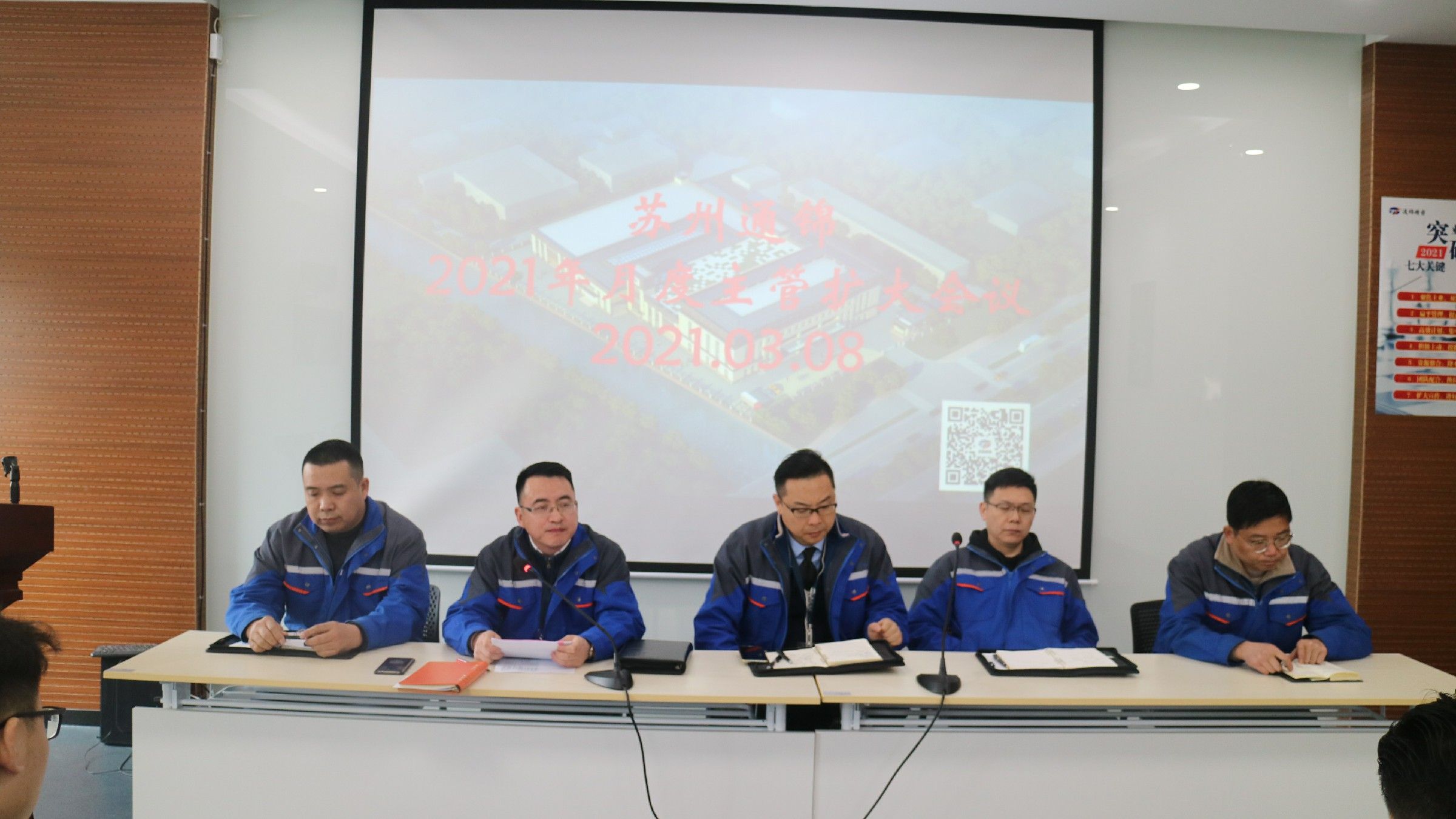 3月8日上午苏州通锦公司2021年3月主管以上扩大会议在公司一楼共享厅顺利召开,会议由公司总经理程先锋先生主持召开,公司领导班子、各部门管理人员参加会议。